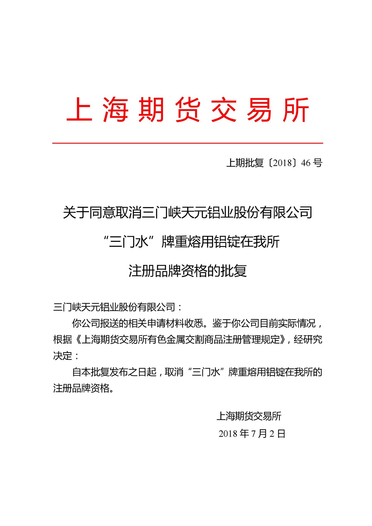 (上期所)关于同意取消三门峡天元铝业股份有限公司“三门水”牌重熔用铝锭在我所注册品牌资格的批复