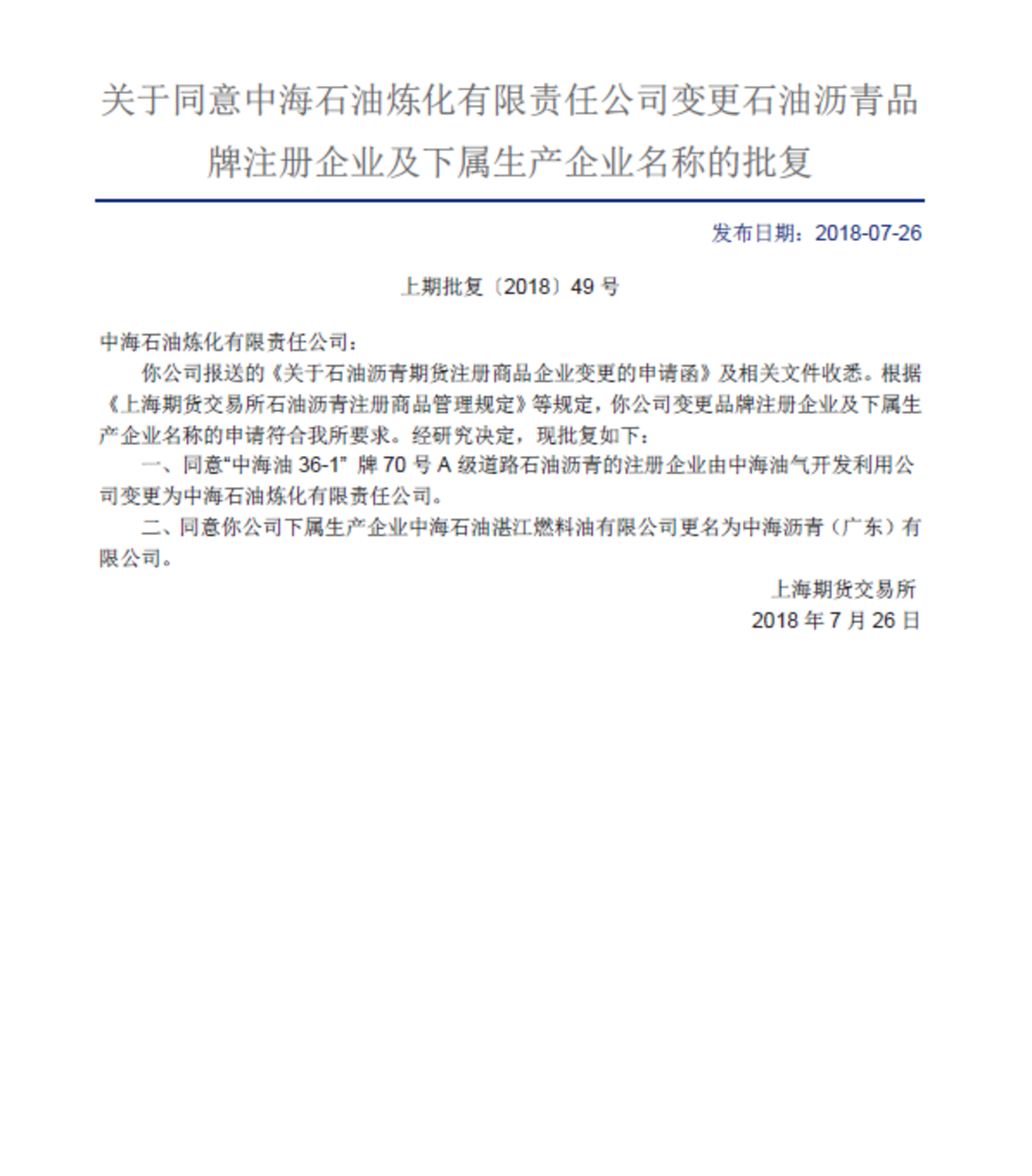 关于同意中海石油炼化有限责任公司变更石油沥青品牌注册企业及下属生产企业名称的批复