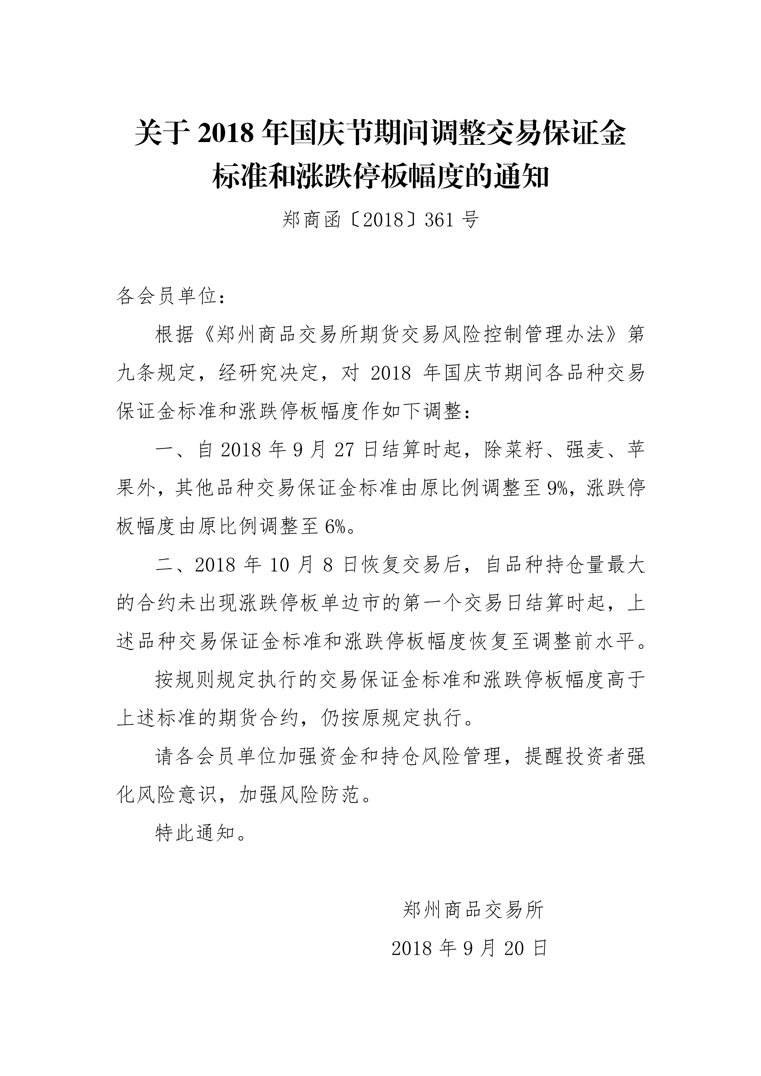 (郑商所)关于2018年国庆节期间调整交易保证金标准和涨跌停板幅度的通知