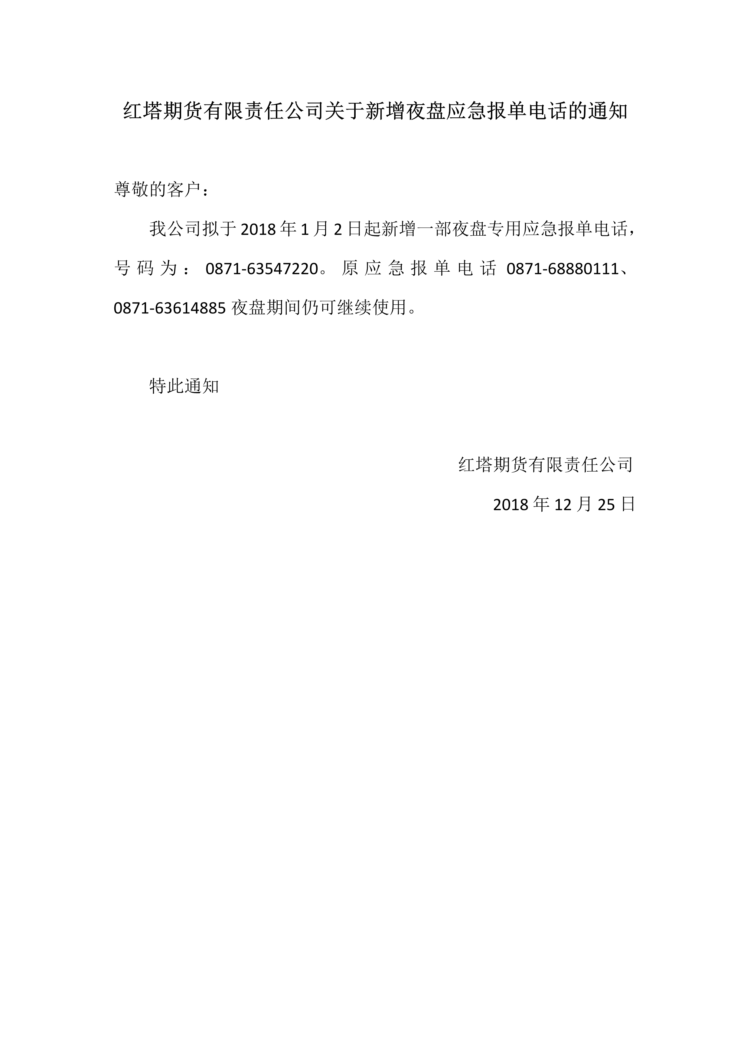 红塔期货有限责任公司关于新增夜盘应急报单电话的通知