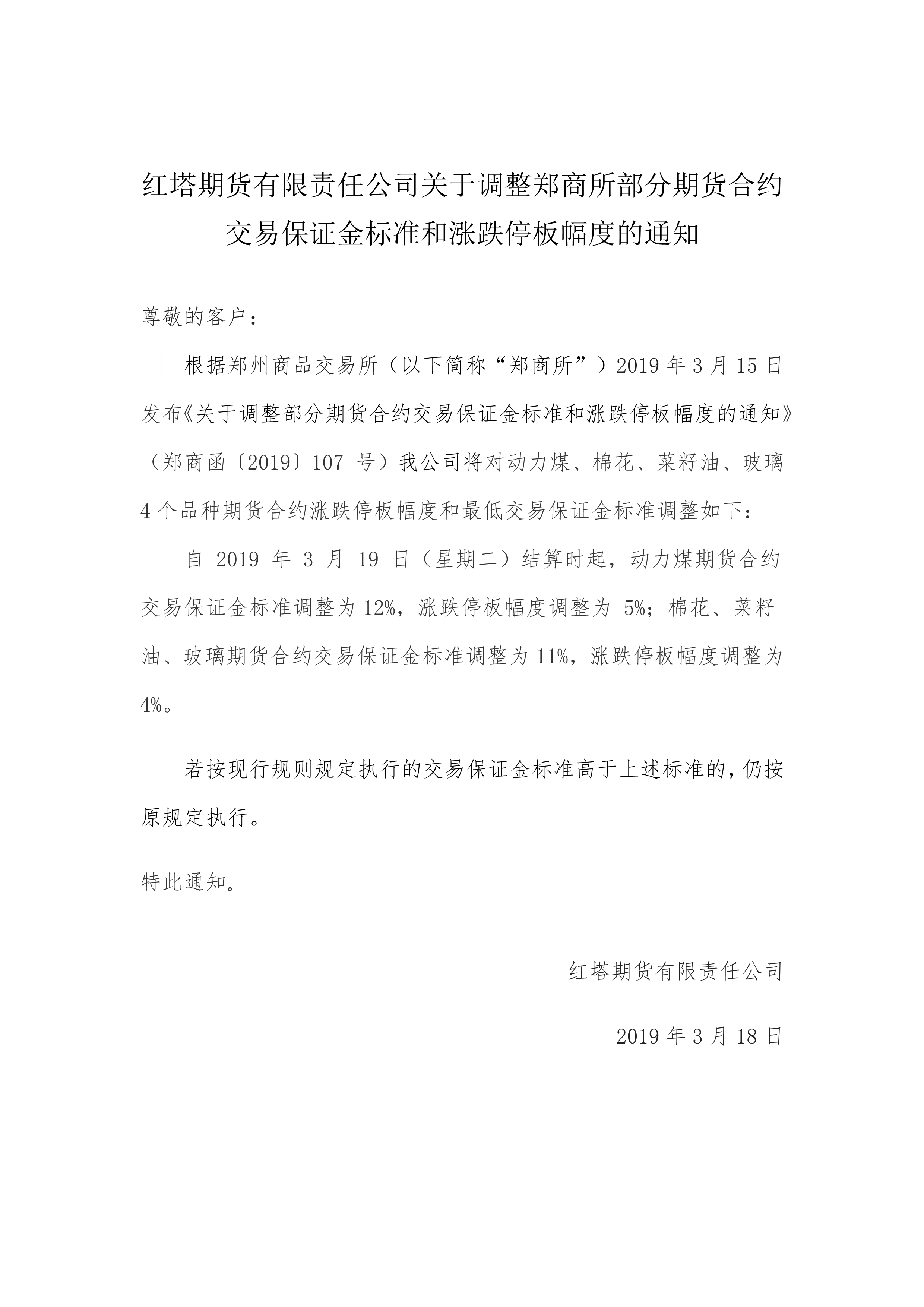 红塔期货有限责任公司关于调整郑商所部分期货合约交易保证金标准和涨跌停板幅度的通知