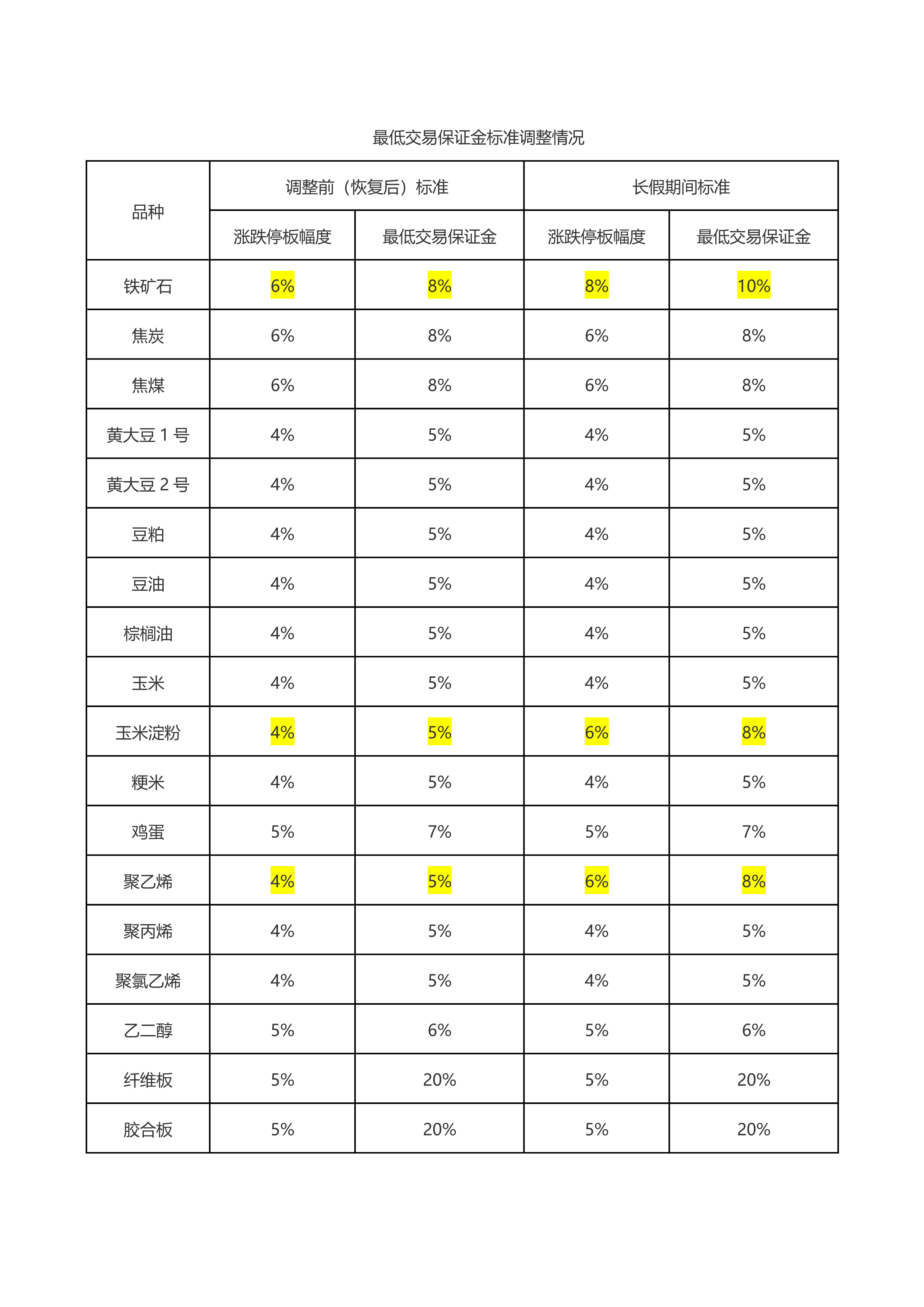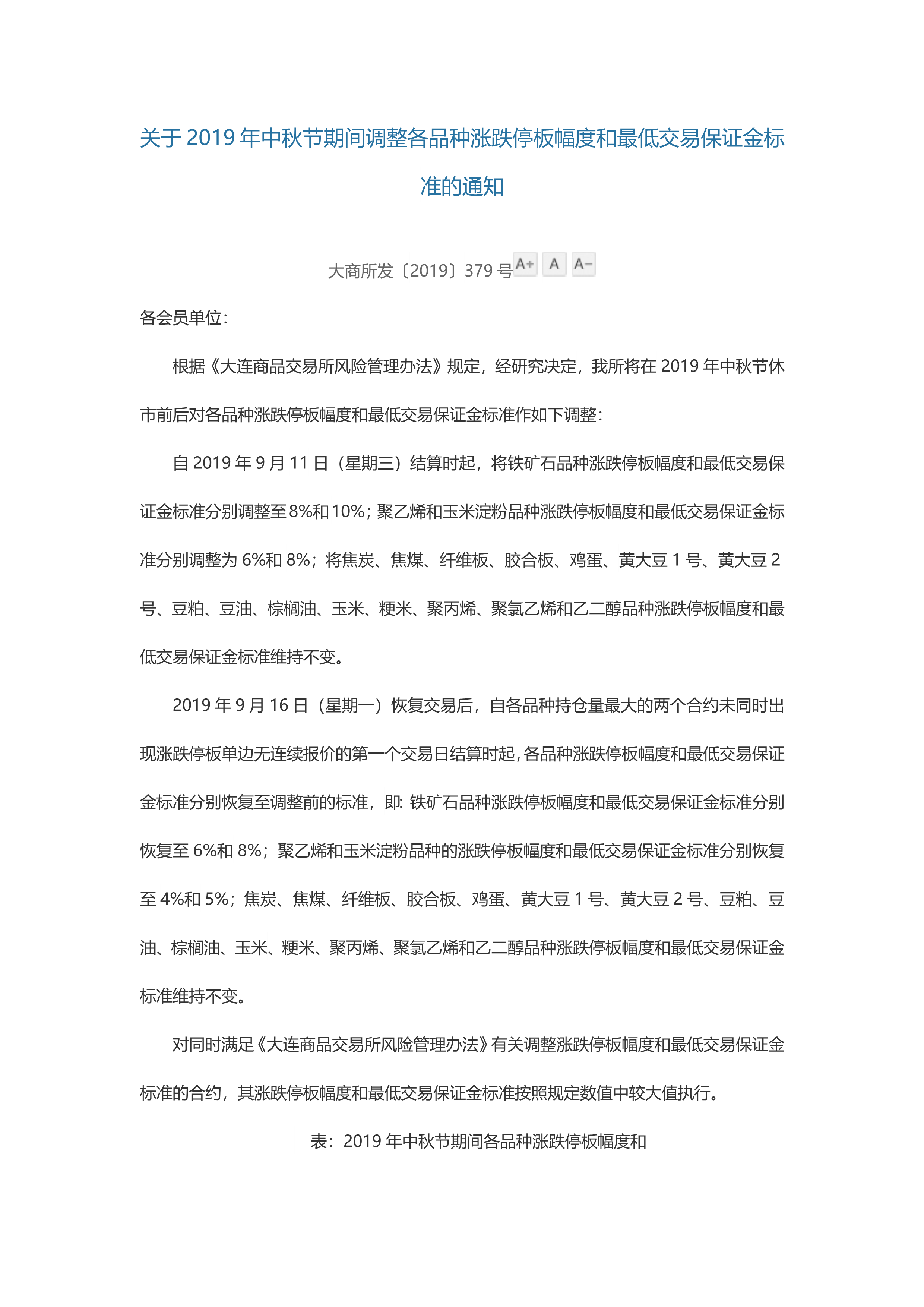 (大商所)关于2019年中秋节期间调整各品种涨跌停板幅度和最低交易保证金标准的通知
