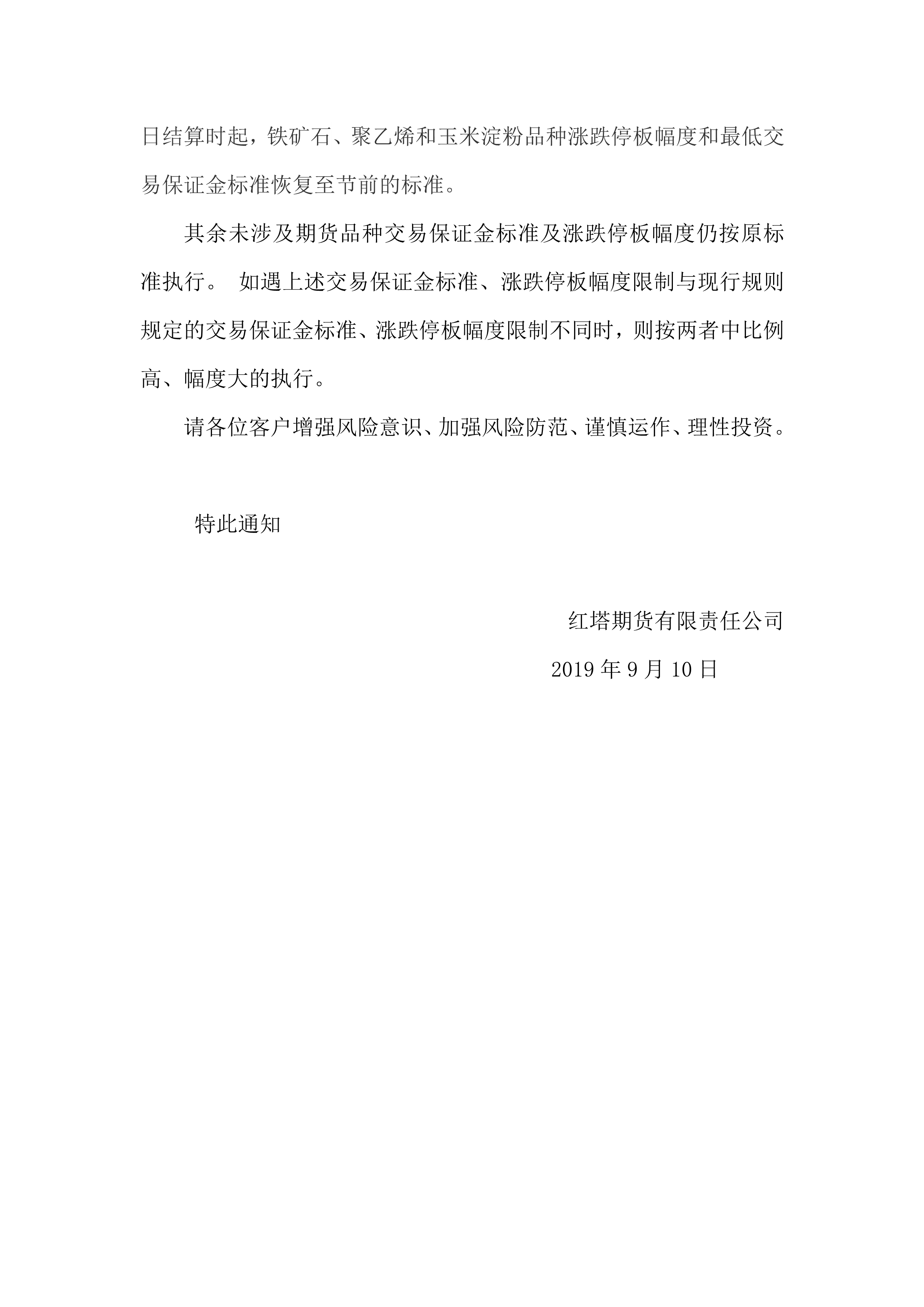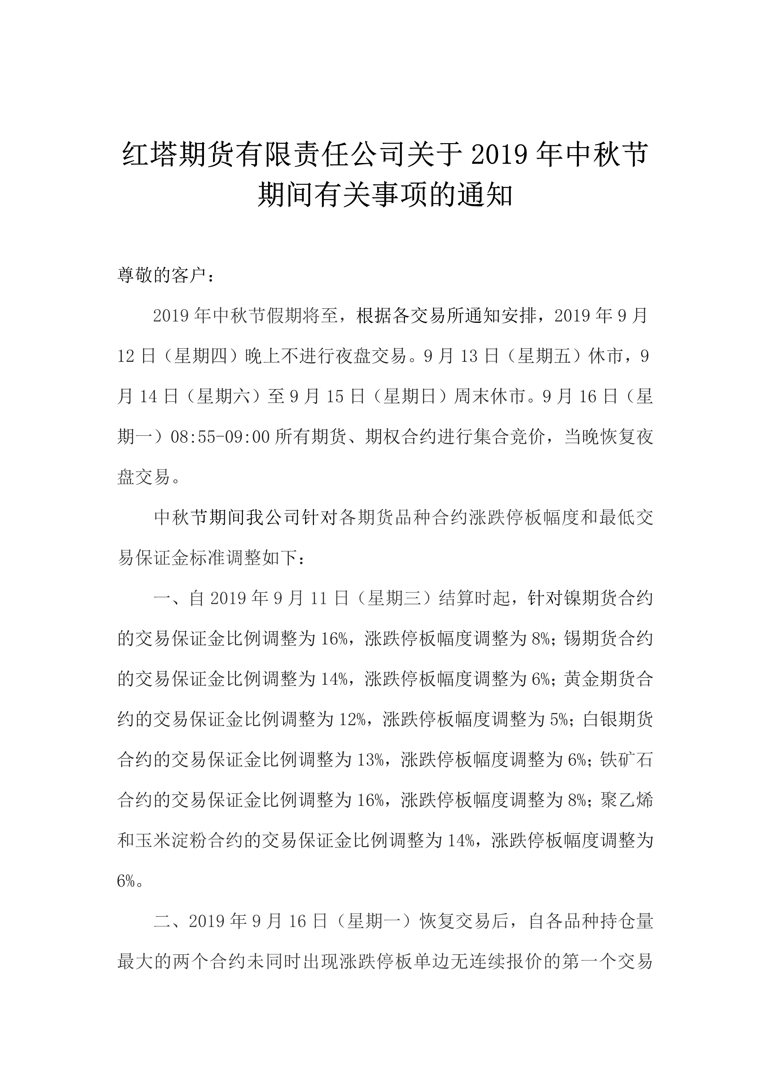 红塔期货有限责任公司关于2019年中秋节期间有关事项的通知