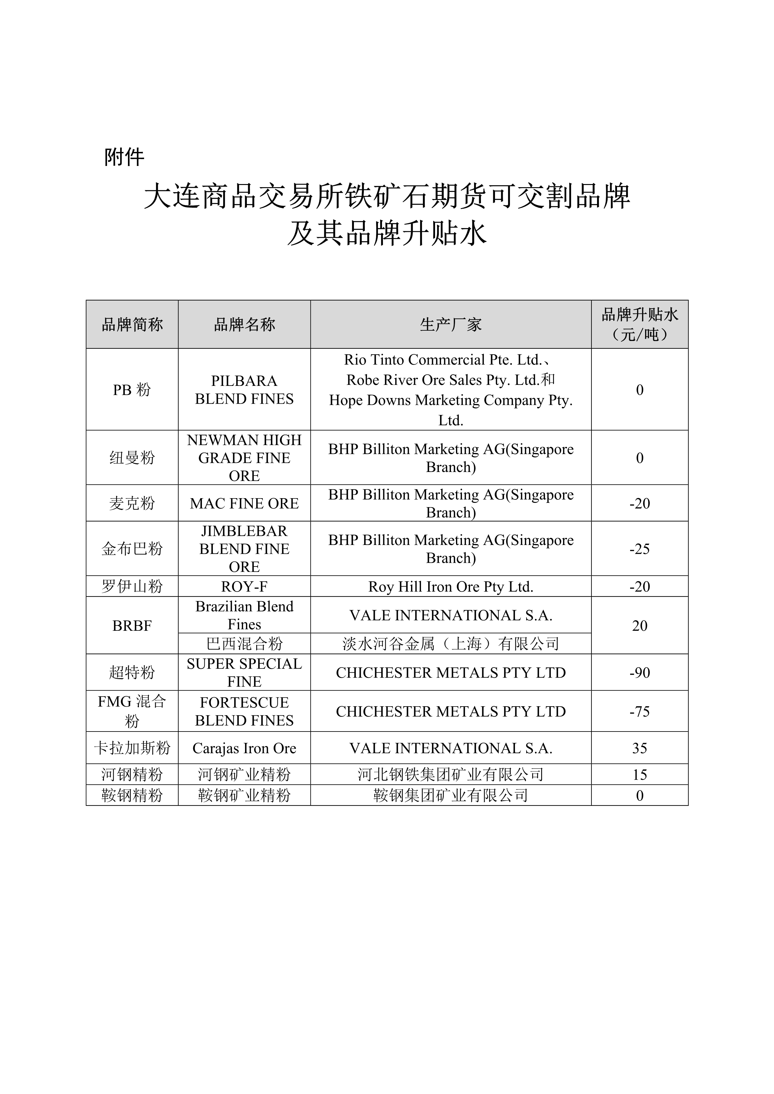 附件:大连商品交易所铁矿石期货可交割品牌及其品牌升贴水