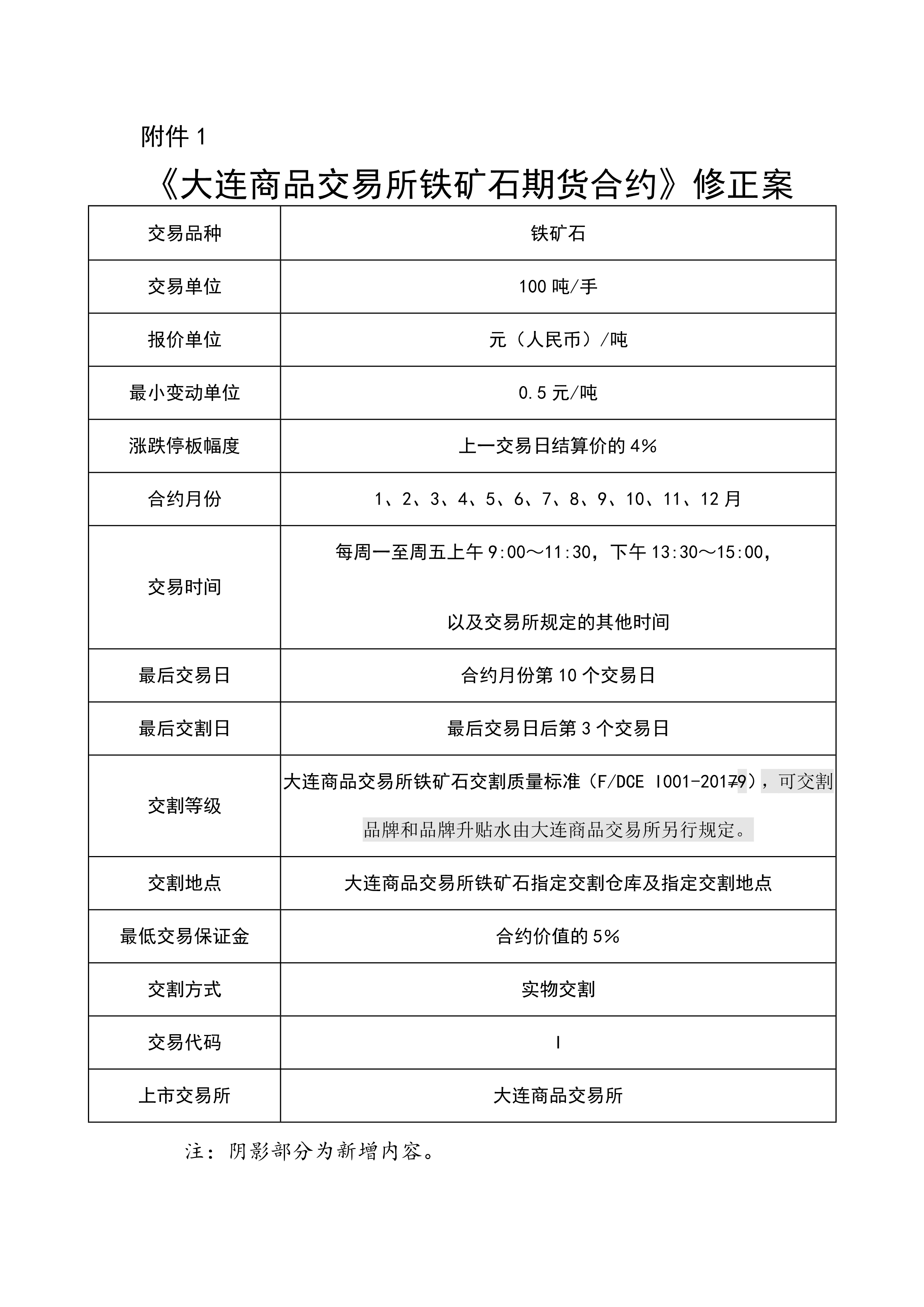附件1:《大连商品交易所铁矿石期货合约》修正案