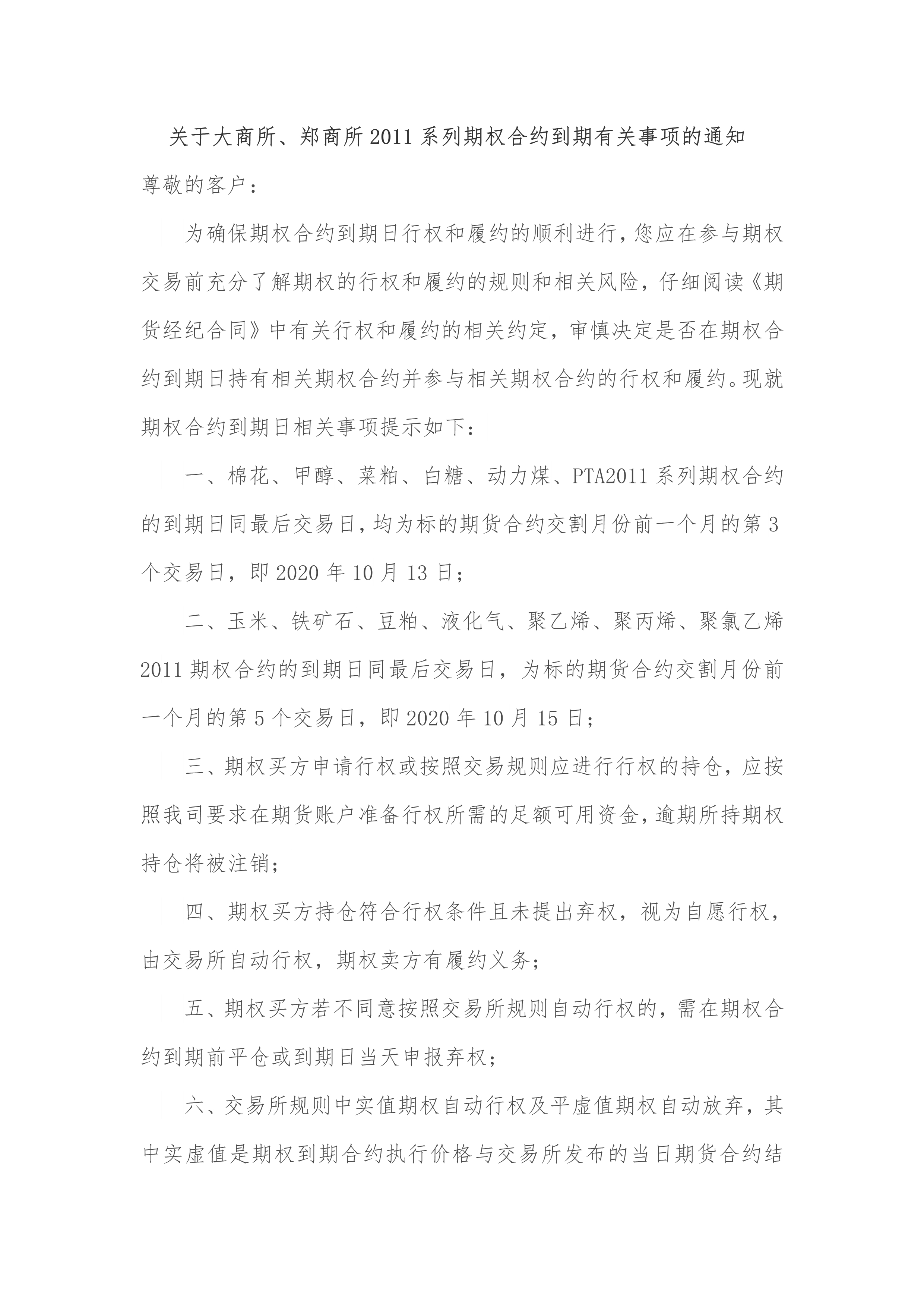 关于大商所、郑商所2011系列期权合约到期有关事项的通知