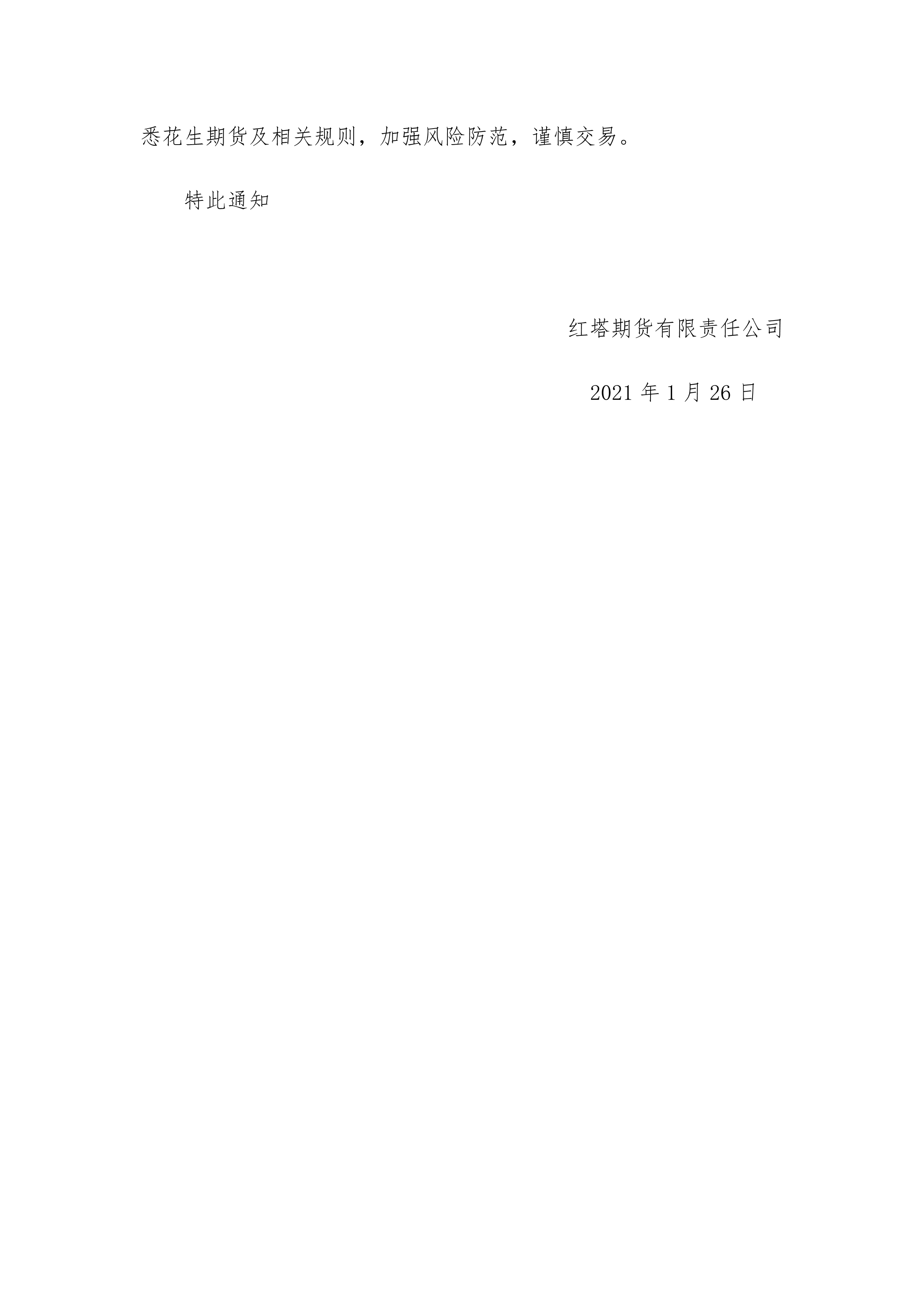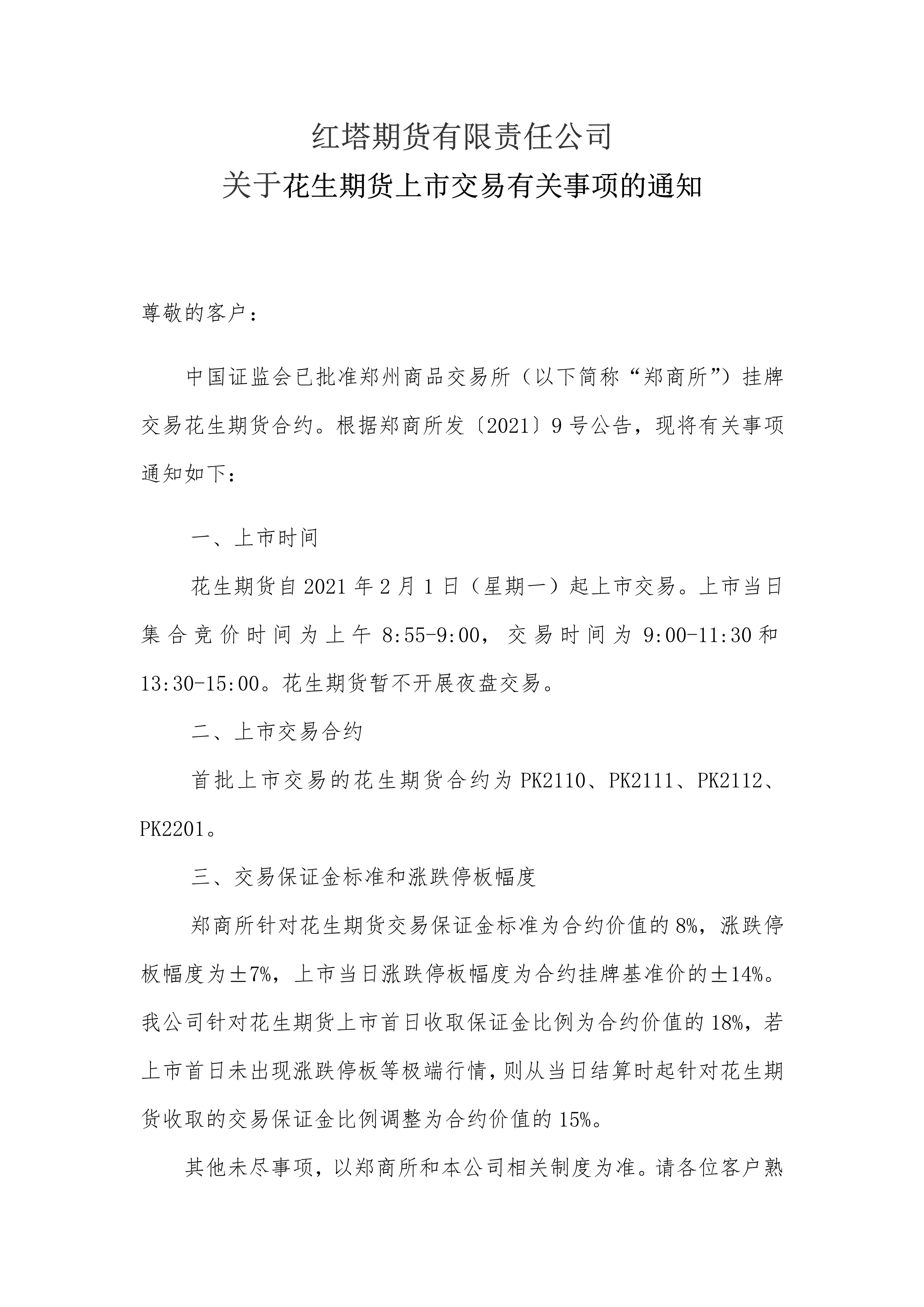 红塔期货有限责任公司关于花生期货上市交易有关事项的通知