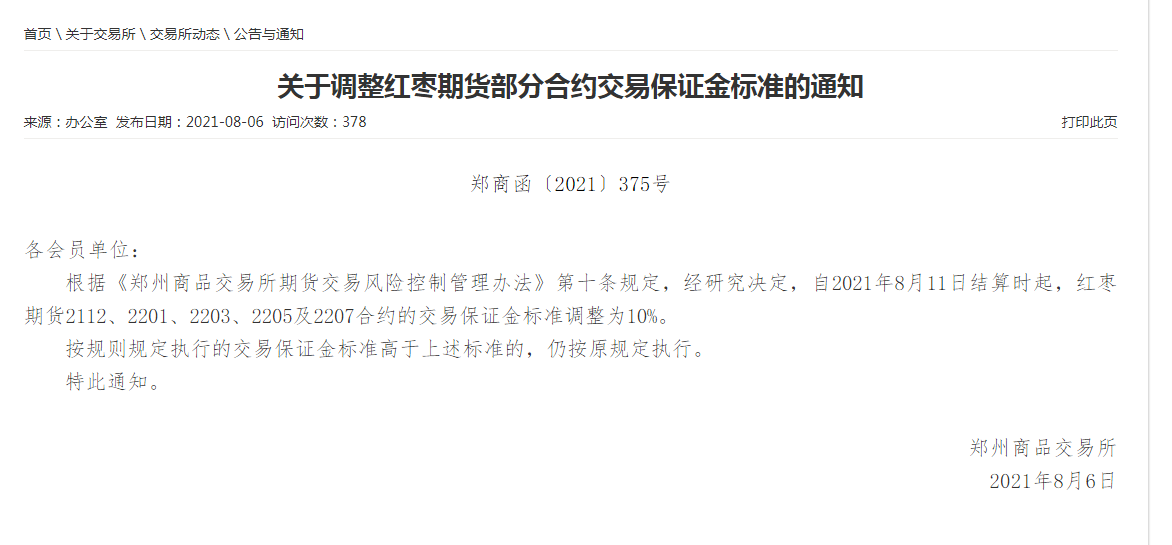 (郑商所)关于调整红枣期货部分合约交易保证金标准的通知