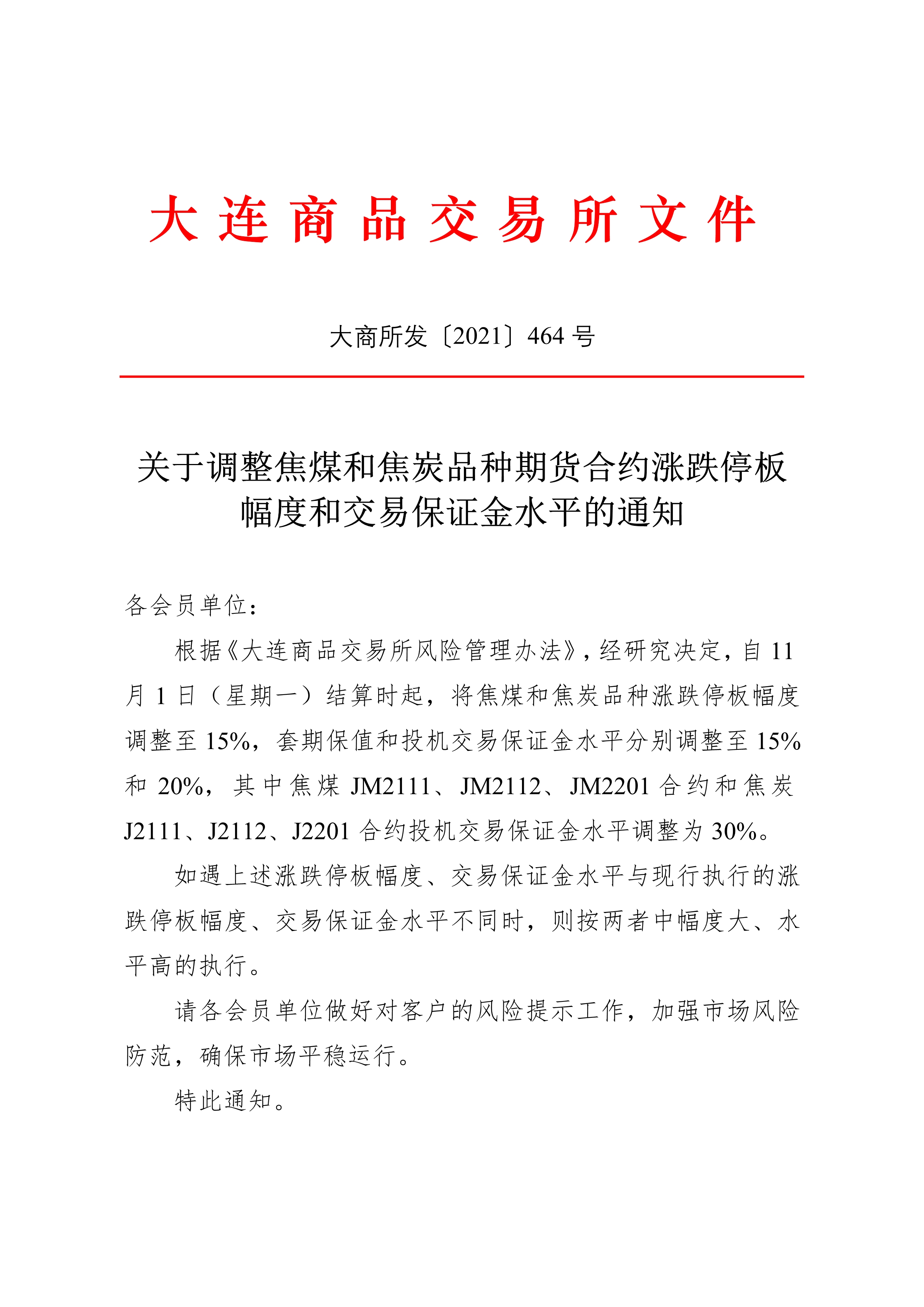 关于调整焦煤和焦炭品种期货合约涨跌停板幅度和交易保证金水平的通知