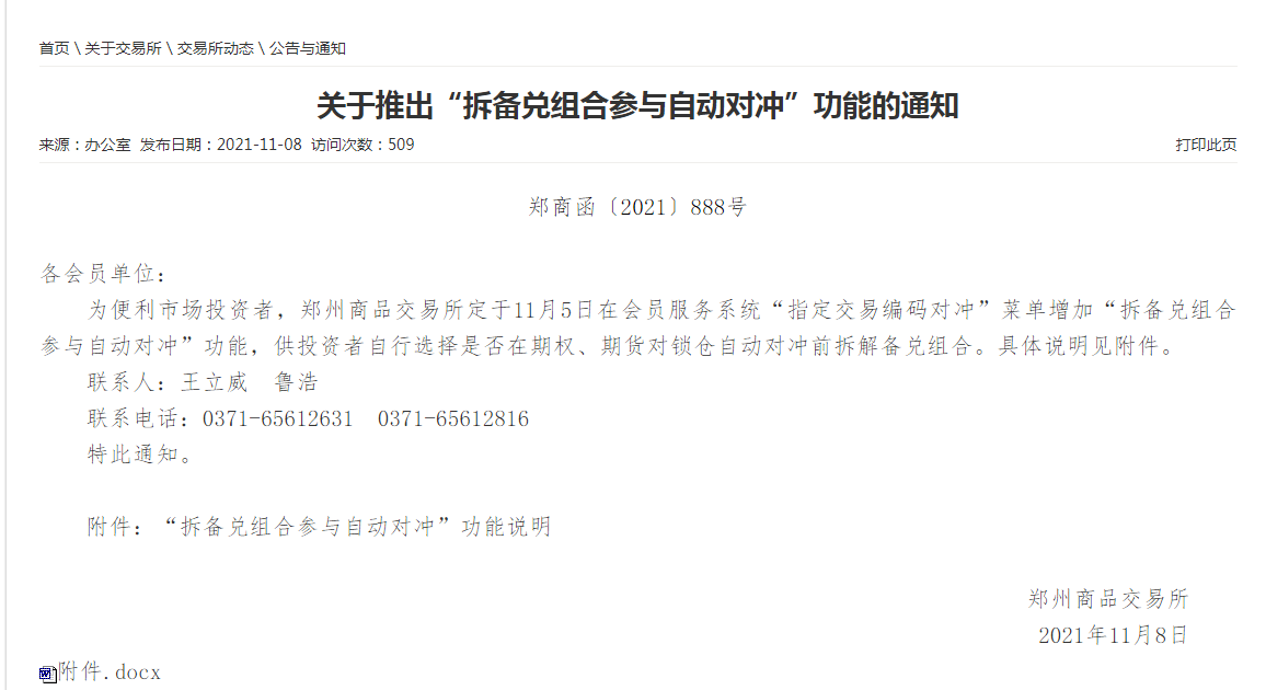 为便利市场投资者,郑州商品交易所在会员服务系统“指定交易编码对冲”菜单下,增加“拆备兑组合参与自动对冲”功能,供已开通对冲功能的投资者自行选择是否在对冲前先行拆解备兑组合。现将有关功能说明如下: