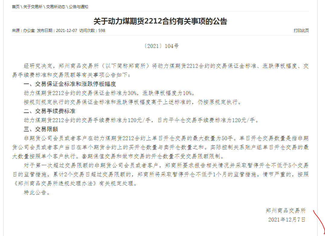 (郑商所)关于动力煤期货2212合约有关事项的公告