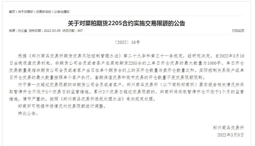 (郑商所)关于对菜粕2205合约实施交易限额的公告